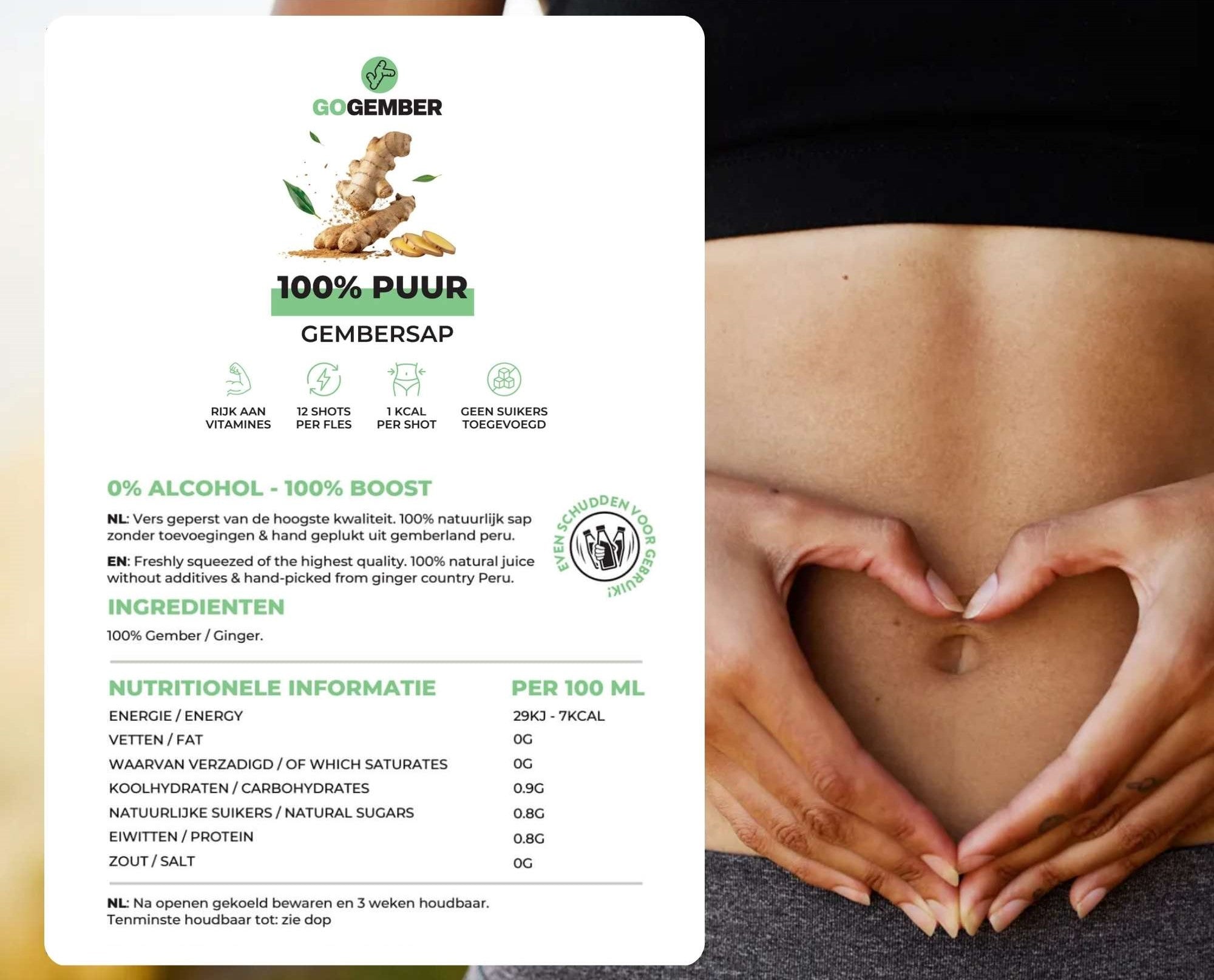 Go Gember betekent puur gembersap in 5 seconden. Nooit meer zelf schillen, snijden, persen & zeven. Hierdoor gaan veel vitamines verloren en bederft het in 3 dagen... Dankzij onze koudpers methode blijft het lang vers en vol voedingswaarde.